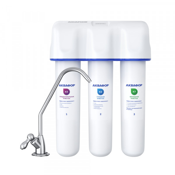 Три картриджа последовательно очищают воду от видимых механических примесей и растворенных вредных веществ. Блок предварительной очистки К3 задерживает частицы размером от 5 микрон, модуль глубокой очистки К2 – от 3 микрон. Третий модуль К7 обеспечивает финишную очистку от частиц до 0,8 микрон (что в 125 раз тоньше человеческого волоса). Карбонблок с Акваленом захватывает и надежно задерживает тяжелые металлы и другие опасные примеси, которые чаще всего встречаются в водопроводной воде.