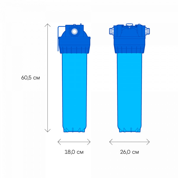 Не забывайте учитывать и срок службы фильтра: он указан в паспорте и определяет, когда модуль нужно заменить, даже если ресурс активной фильтрации в литрах еще есть.60000Габариты26,0 x 18,0 x 60,6 смСорбцияСпособность “впитывать” из воды растворенные, “невидимые” вредные примеси, по принципу губки. Активированный уголь - основной сорбционный материал, который используется в картриджах фильтров для питьевой воды. Например, именно так из воды удаляется хлор.даСкорость фильтрации, л/минСкорость подачи отфильтрованной воды из крана чистой воды на мойке. Например, при скорости фильтрации 2,5 литра/минуту стакан 200 мл. наполнится меньше, чем за 10 секунд.20,0КомплектацияГотовый фильтр состоит из корпуса и картриджа для очистки воды. Если вы приобретаете только корпус, необходимо отдельно купить подходящий к нему картридж: это может быть картридж для механической очистки воды от ржавчины, картридж для глубокой очистки воды от хлора.готовый фильтрВодаКартриджи и корпуса фильтров рассчитаны на определенную температуру воды. Данные технические характеристики важно учитывать, поскольку от этого зависит качество очистки и срок службы фильтра.холоднаяМатериал корпусаПищевой пластик: Допущен к контакту с пищевыми продуктами. Нержавеющая сталь: Долговечный и безопасный корпус из нержавеющей пищевой стали.пищевой пластикОчисткаМеханическая очистка: Задерживает ржавчину, ил, песок, как “сито”. В корпусе предфильтра с механической очисткой установлен полипропиленовый модуль. Глубокая очистка: Подходит, чтобы купать детей в чистой воде. Делает прием душа и умывание более приятным. Фильтр глубокой очистки воды во всей квартире не только останавливает ржавчину, ил, песок, но и впитывает растворенные опасные примеси, как губка. Удаляет из воды хлор, хлорорганические вещества, пестициды и другие загрязнители.глубокаяДля холодной водыда